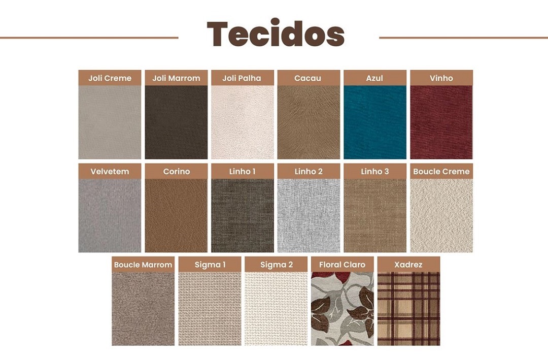 Opções de tecidos para o estofado: Joli Creme | Joli Marrom | Joli Palha | Linho | Linho 2 | Linho 3 | Velvetem | Azul.