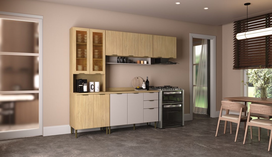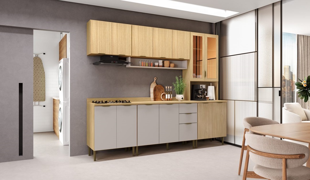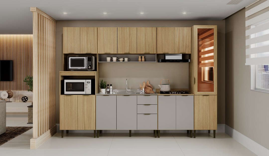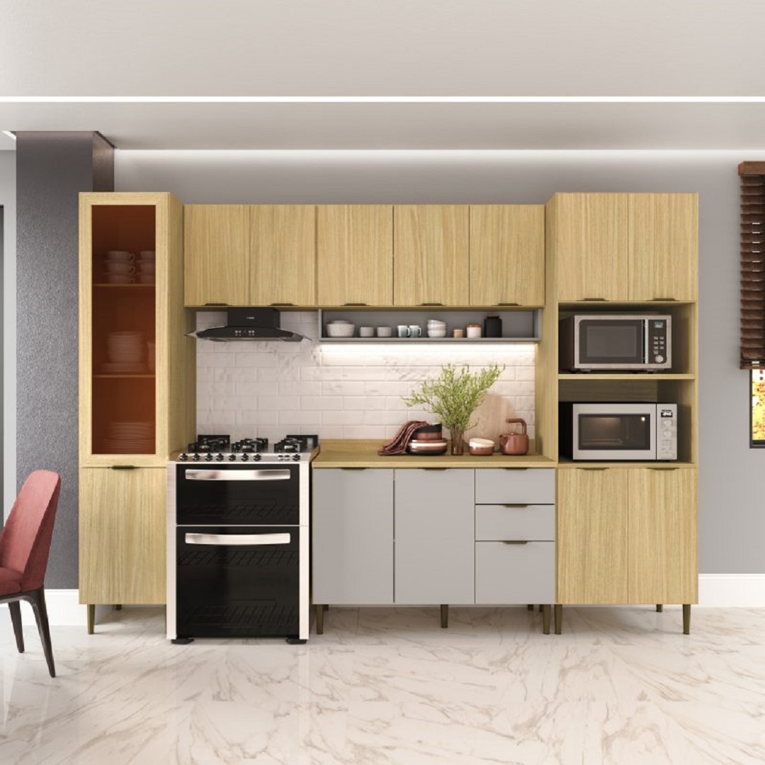 • Design Sofisticado: Disponível na elegante cor Louro Freijó, com portas e gavetas inferiores em um charmoso tom de Cinza, valorizando o ambiente.