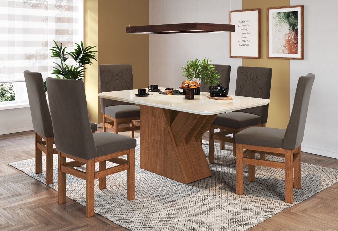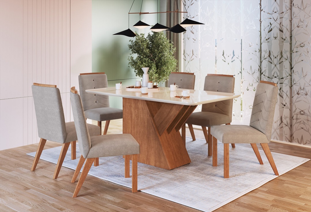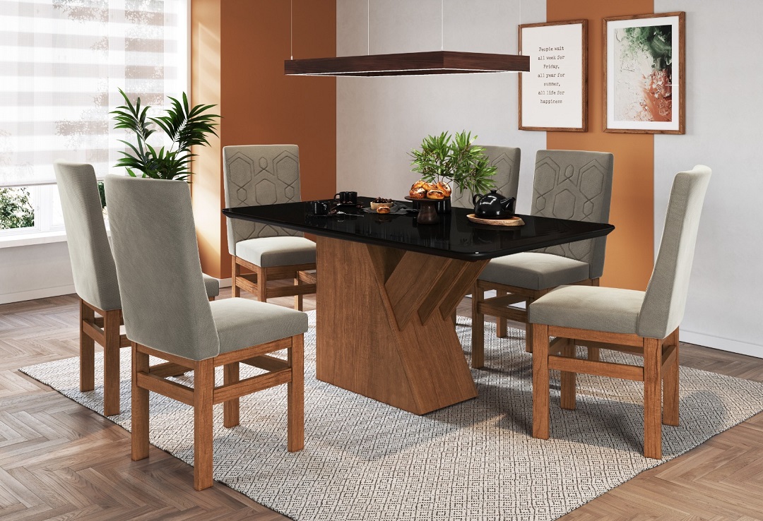 Mesa de jantar retangular com pé central em madeira e tampo com vidro, ideal para ambientes modernos e elegantes.